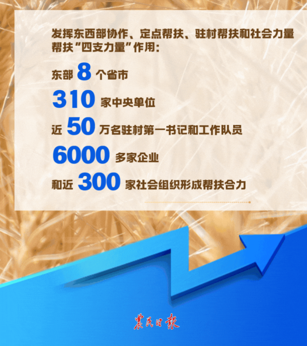 “十四五”时期,各地持续聚焦160个国家乡村振兴重点帮扶县、3.5万个易地搬迁集中安置区等重点区域。对国家乡村振兴重点帮扶县出台财政、金融、土地、人才等14方面倾斜支持政策,强化科技、医疗、教育等人才“组团式”帮扶。有劳动能力的搬迁脱贫家庭基本实现一人以上就业目标,让搬迁群众稳得住、逐步能致富。此外,农业农村部还充分发挥东西部协作、定点帮扶、驻村帮扶和社会力量帮扶“四支力量”作用,东部8个省市、310家中央单位、近50万名驻村第一书记和工作队员、6000多家企业和近300家社会组织倾力帮扶,形成了全社会参与帮扶的浓厚氛围。