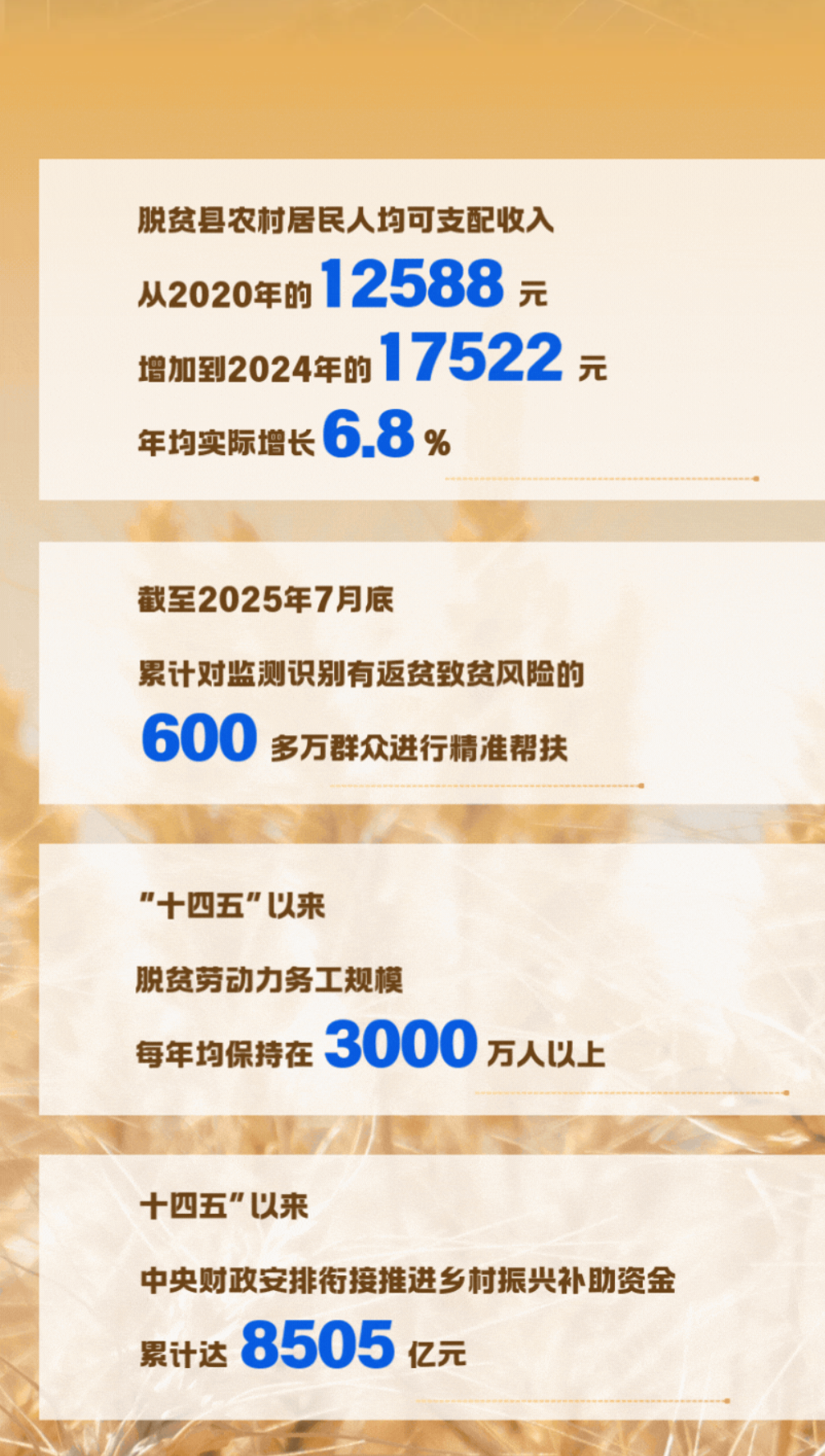 “十四五”以来,脱贫人口务工就业规模连续4年稳定在3000万人以上。据统计,脱贫县农村居民人均可支配收入从2020年的12588元增加到2024年的17522元。政策不断档,帮扶不松劲。