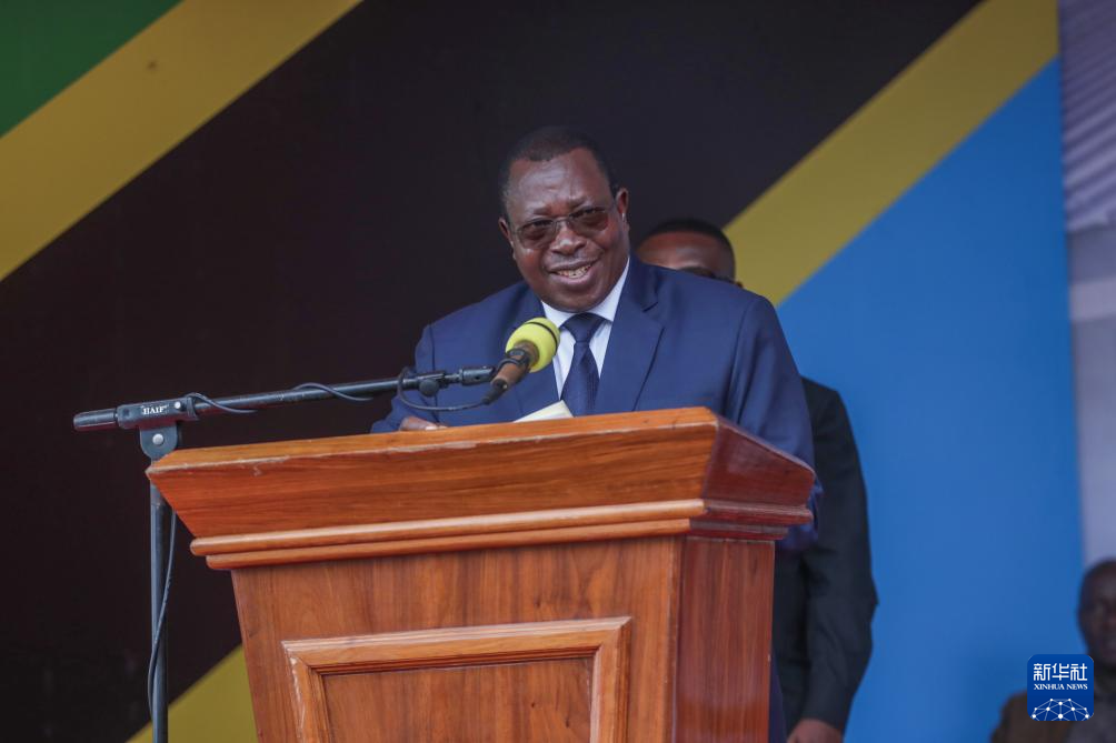10月16日,在坦桑尼亚阿鲁沙省恩戈罗恩戈罗保护区,坦桑尼亚副总统姆潘戈在恩戈罗恩戈罗-伦盖地质公园项目移交仪式上致辞。