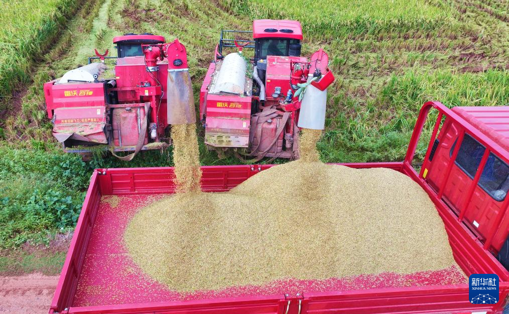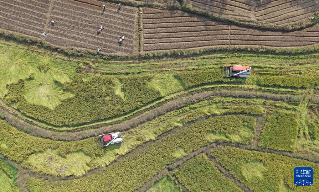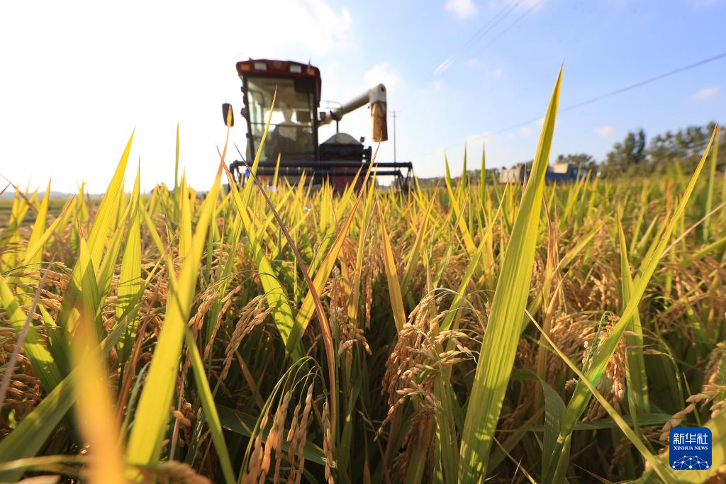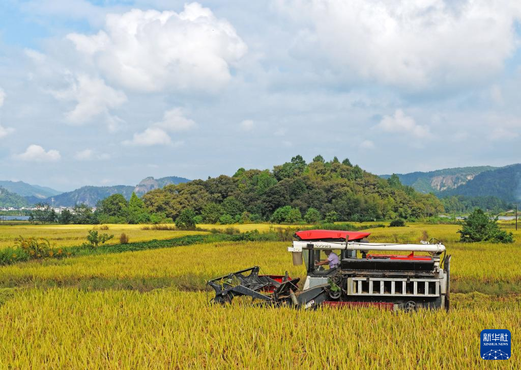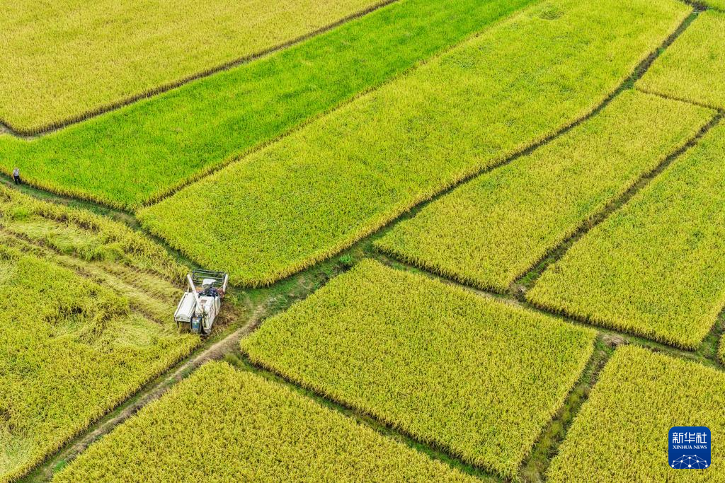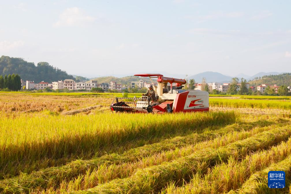 10月15日,在湖南省永州市新田县新圩镇上禾塘村,村民驾驶收割机收获晚稻。