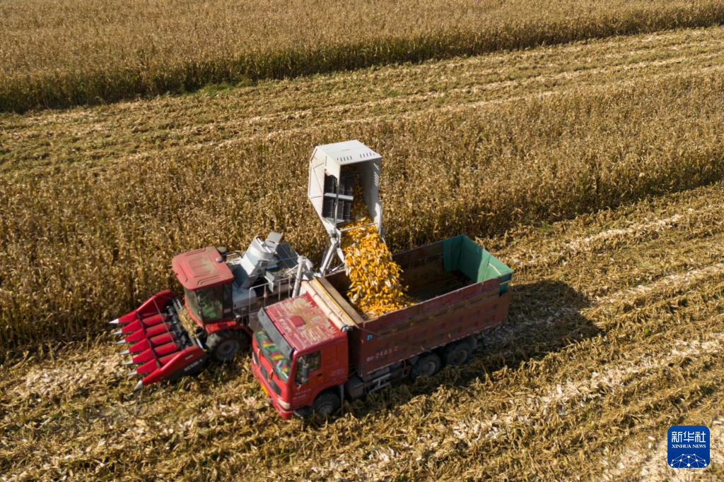10月15日,在河北省内丘县大原村,村民驾驶机械收获玉米(无人机照片)。