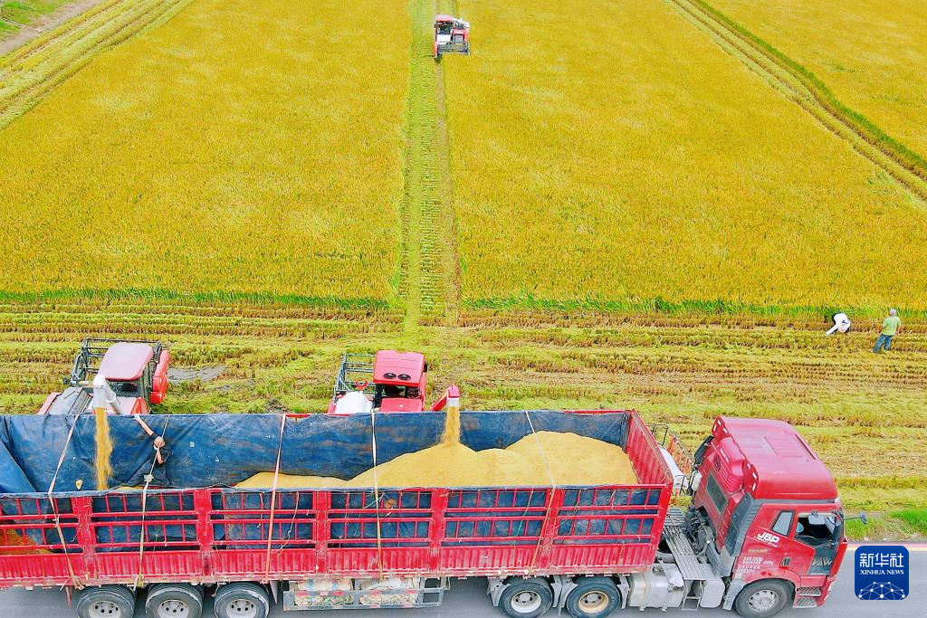 10月17日,在湖南省永州市道县梅花镇梅花村,水稻种植大户采用大型机械收获稻谷(无人机照片)。
