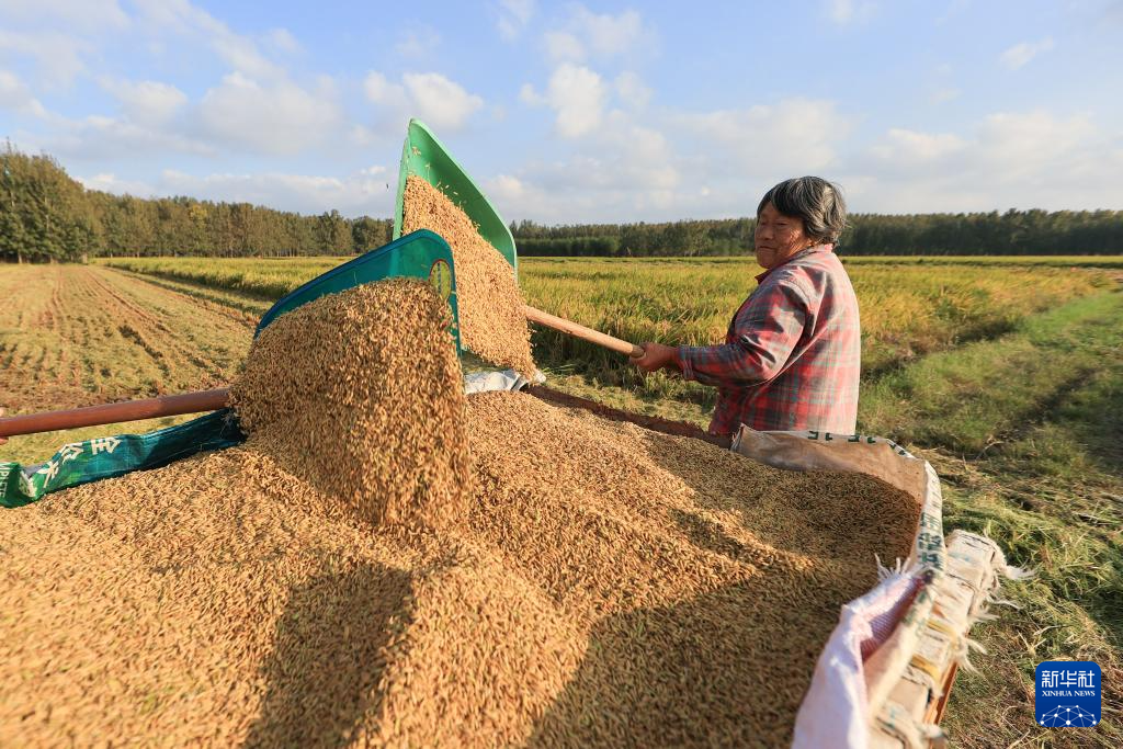 10月16日,在江苏省连云港市赣榆区城头镇中青墩村,种植户将收获的水稻装车。