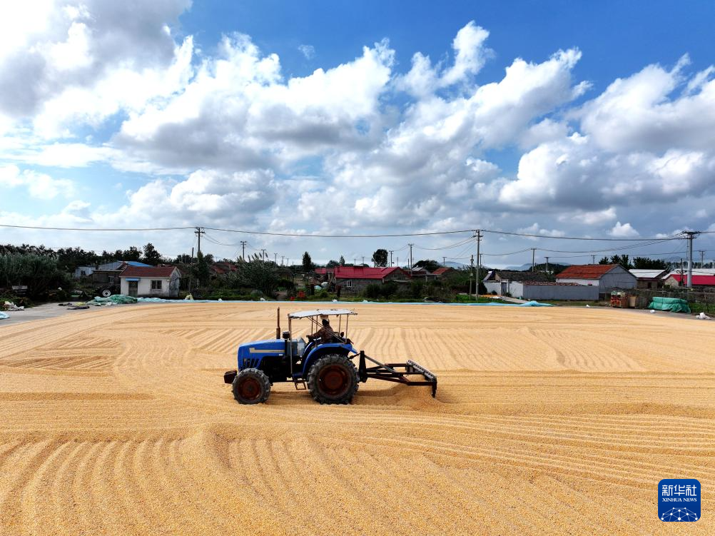 10月16日,在江苏省连云港市东辛农场,农机手操作机械翻晒玉米(无人机照片)。