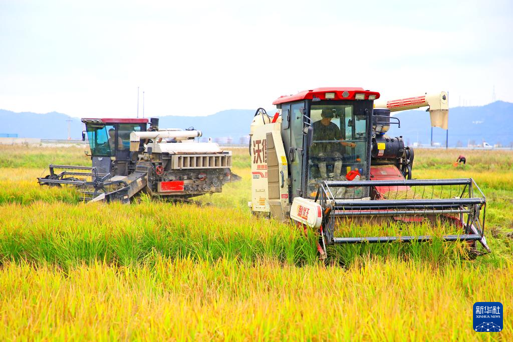 10月19日,农机手驾驶农机在浙江省玉环市漩门湾三期智慧农业示范基地内收割海水稻。