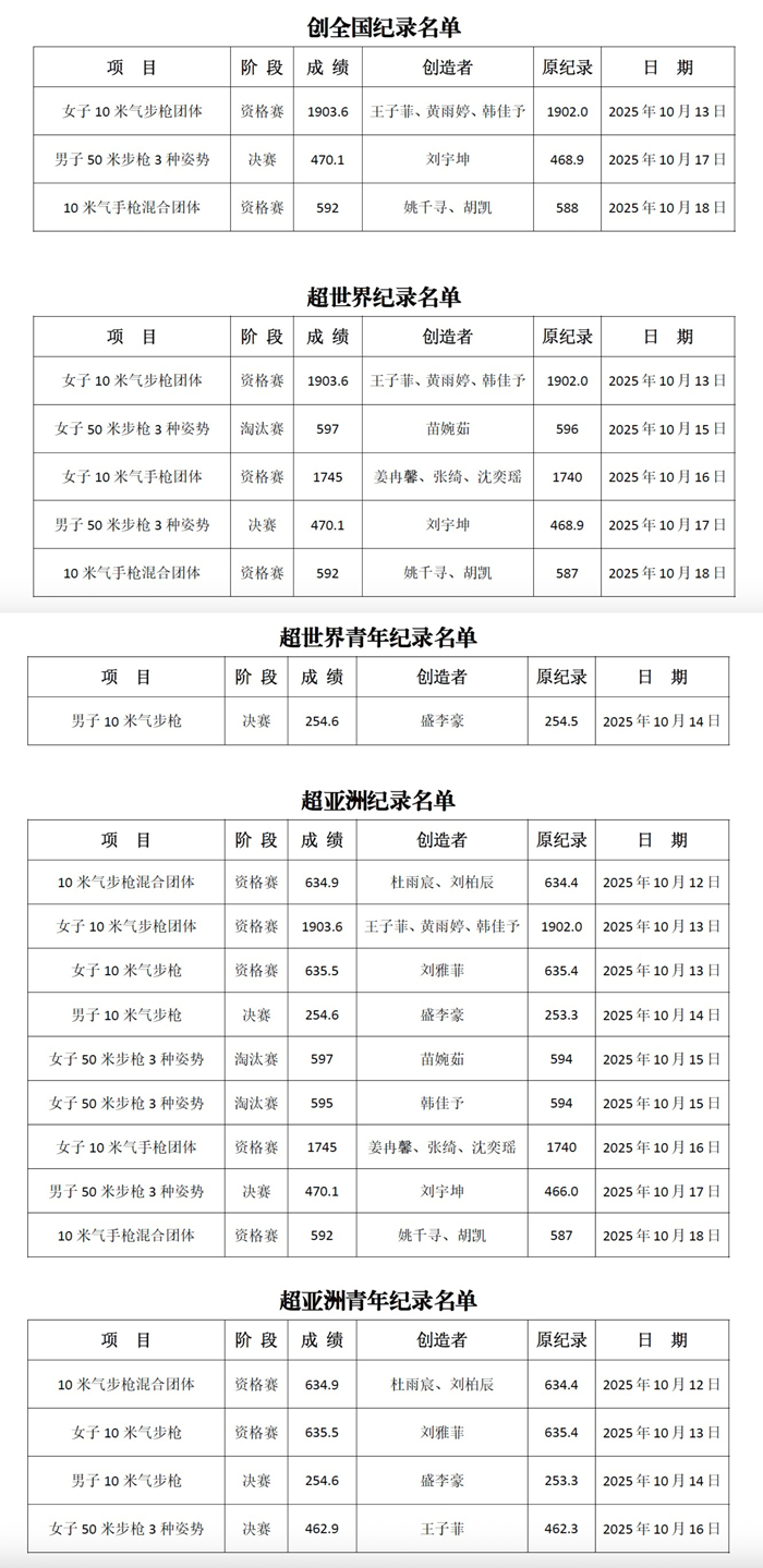 以上5个项目中,女子10米气步枪团体、男子50米步枪三姿决赛和10米气手枪混合团体刷新了全国纪录。