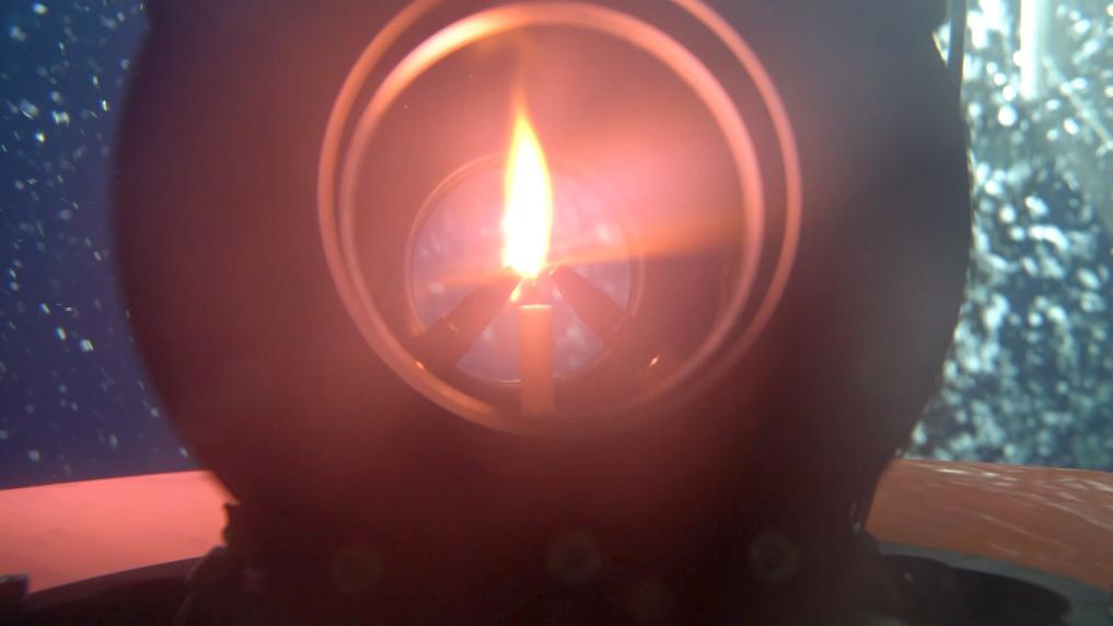 发现目标后,科研人员随即开始进行采集取样。采集到足够的可燃冰后,科研人员降压使其分解,产生的甲烷气体即为“源火”的气源。随后,科考船甲板面的太阳能光伏装置发电并传输到海底,引燃气源获取“源火”。