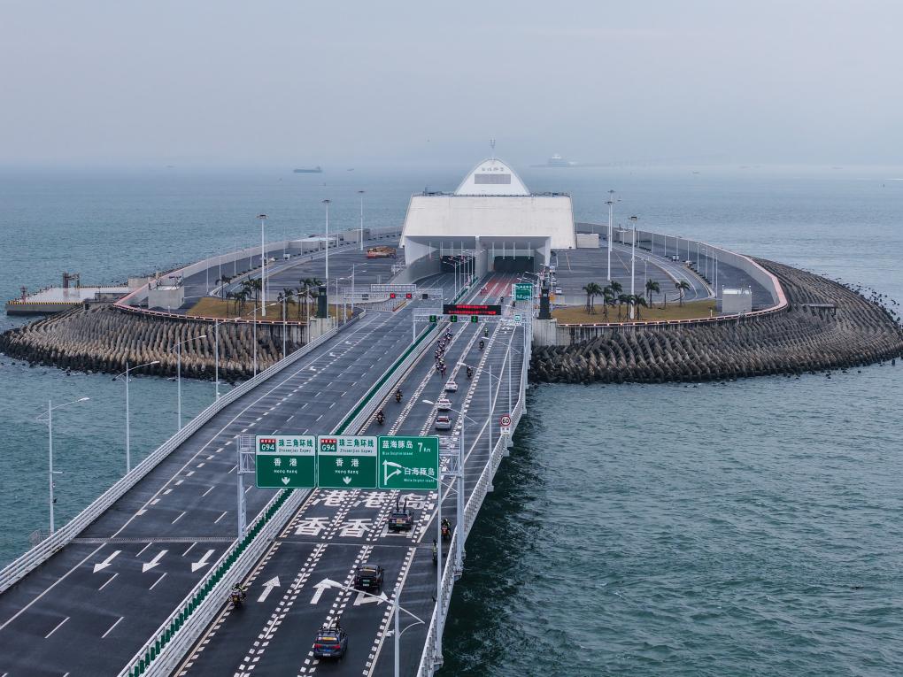 2024年11月24日,2024粤港澳公路自行车赛暨第十五届全国运动会公路自行车测试赛举行,图为参赛选手骑行到港珠澳大桥海底隧道西入口(无人机照片)。新华社记者 刘大伟 摄