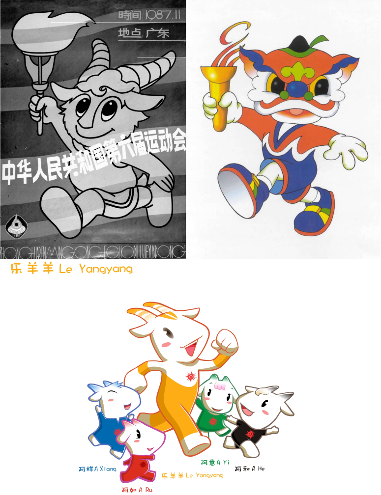 左上为六运会吉祥物“阳阳”,右上为九运会吉祥物“威威”,下为广州亚运会吉祥物“乐羊羊”。新华社发