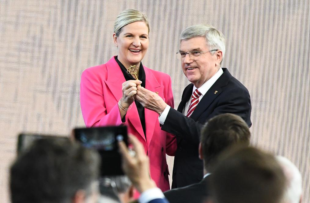 6月23日,托马斯·巴赫和柯丝蒂·考文垂(左)在主席职位交接仪式上。新华社记者 连漪 摄