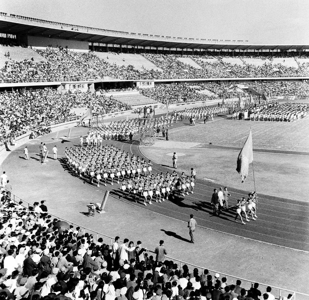 图为1959年9月13日,运动员在开幕式上列队步入会场。 新华社发