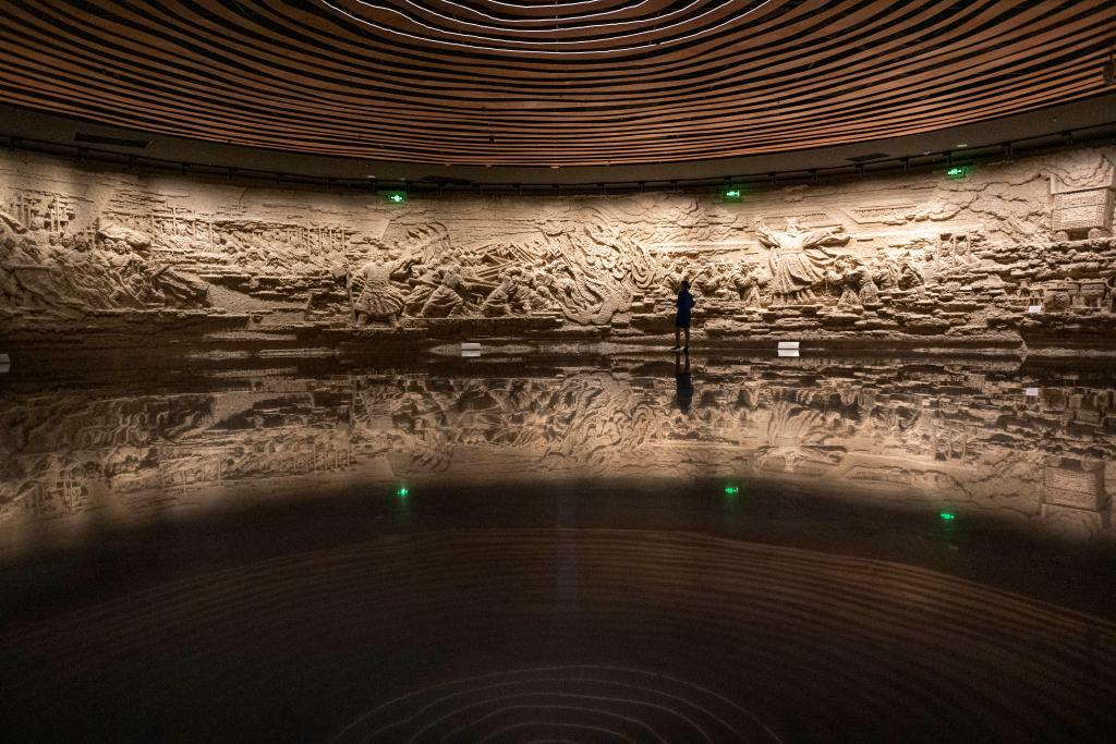 这是在郑州商都遗址博物院展厅内拍摄的环形浮雕墙。新华社记者 徐嘉懿 摄