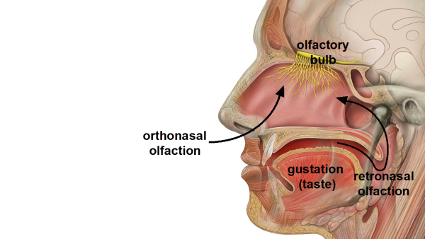 我们感知到气味的两条通路:鼻前通路和鼻后通路。