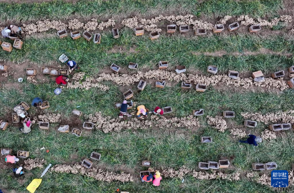 10月26日,河北省唐山市丰南区大新庄镇的农民在田间收获生姜(无人机照片)。