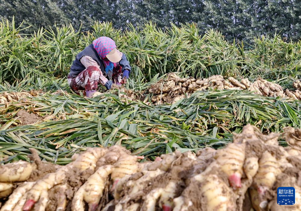 10月26日,河北省唐山市丰南区大新庄镇的农民在田间收获生姜。
