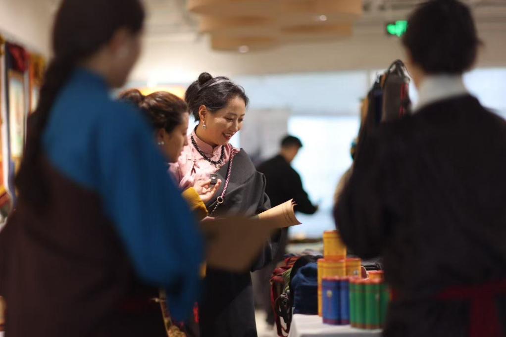 在“麦宿手艺人&守艺人”成都巡展活动现场,达瓦卓玛(左三)为参观者介绍展品(10月24日摄)。新华社发