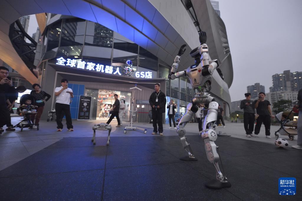 10月28日,在位于广东深圳的机器人6S店门口,机器人在跳舞。新华社记者 刘力航 摄