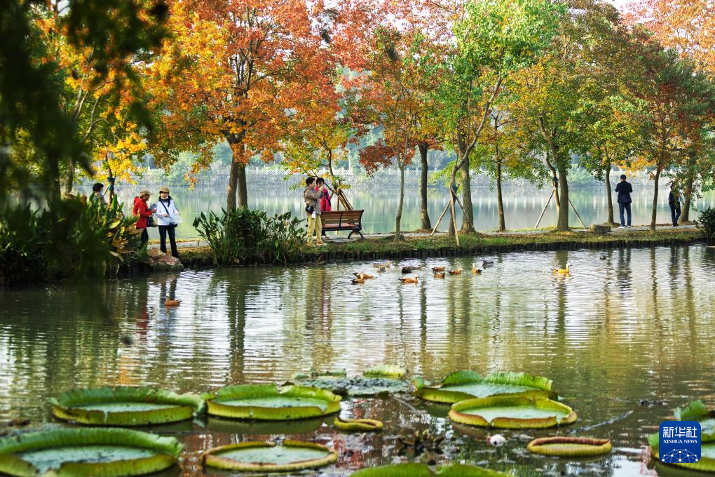 11月2日,人们在南京中山植物园月牙堤上观赏秋景。