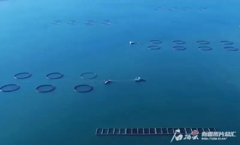 俯瞰尼勒克县三文鱼养殖基地,圆形养殖网箱错落有致地分布在天然水库之中。赵学林摄