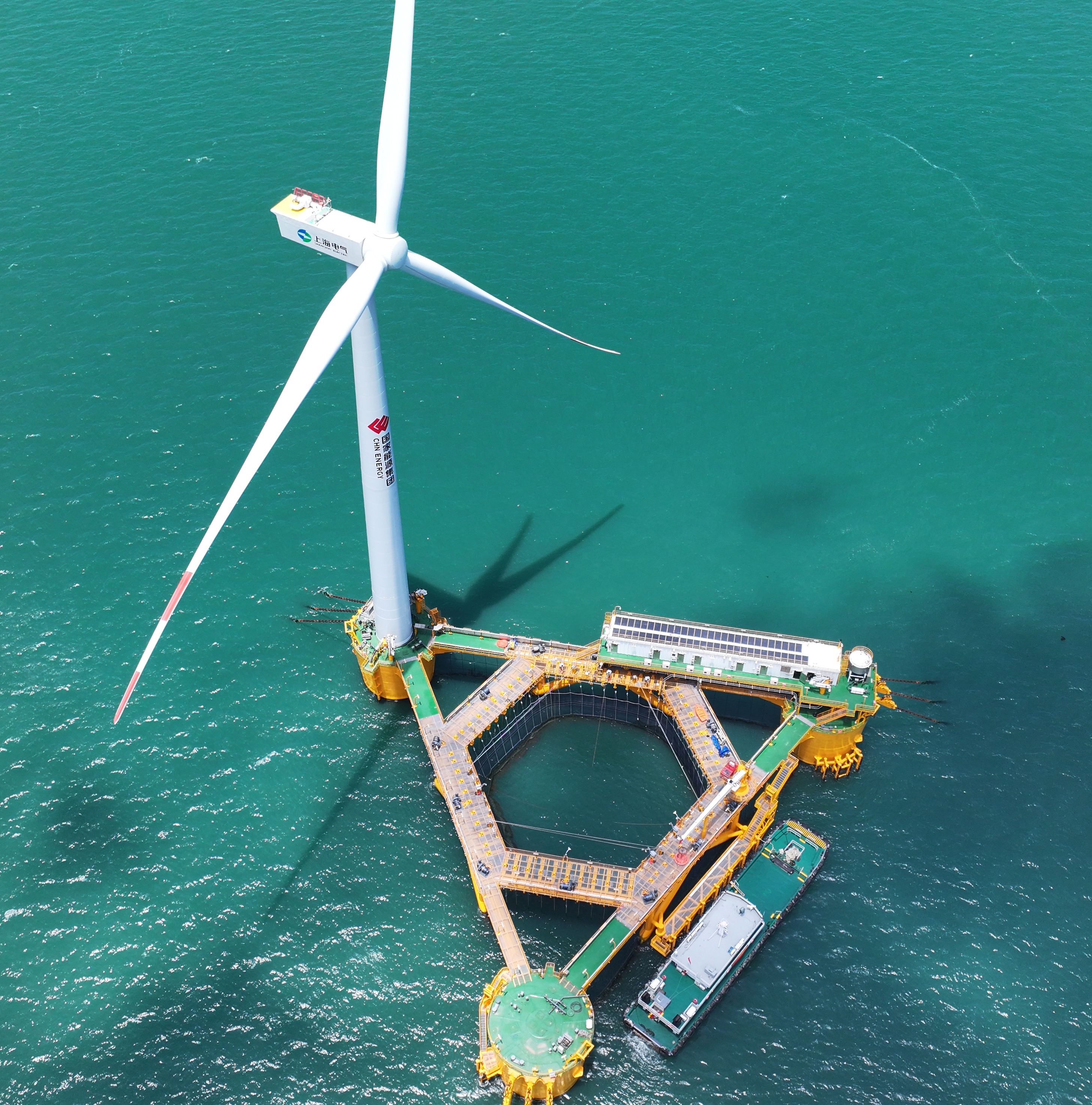 目前,该设计方案已成功应用于全球首个深远海浮式风电与养殖一体化设计项目“国能共享号”平台。该平台主要由“漂浮式风机+养殖网箱”组成。平台设计吃水14米,养殖水体约10000立方米,具备5万尾深海鱼类的养殖能力,相当于近岸17万平方米鱼塘的产量,较传统近岸养殖模式产量提升超两倍,一个养殖周期的鱼品收入可达到数百万元。平台在满载负荷发电状态下,每小时可发电4000千瓦时,单日满负荷运转可发电96000千瓦时,相当于4.25万人一天的生活用电量。