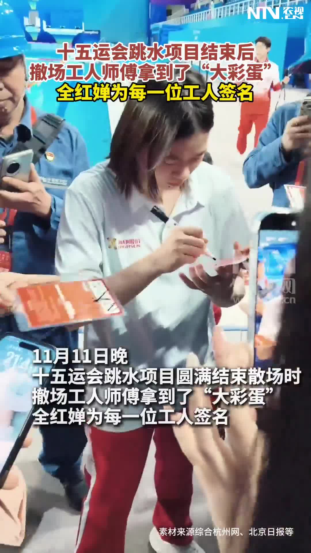 十五运会跳水项目结束后全红婵为每一位工人签名