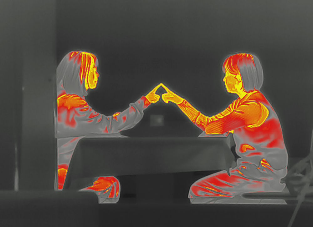 2023年12月24日,在全黑的环境中,就餐者尝试接触手指(热成像摄影)。新华社记者 才扬 摄