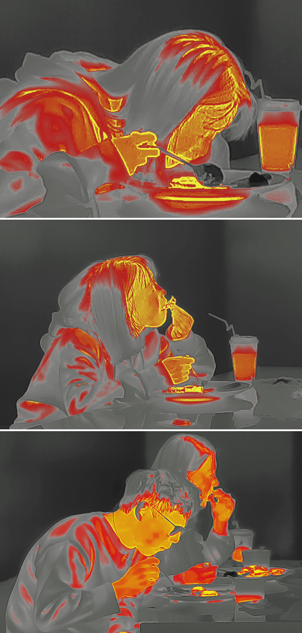 这是一张拼版照片。就餐者在全黑的环境中进餐(2023年12月24日摄,热成像摄影)。新华社记者 殷刚 摄