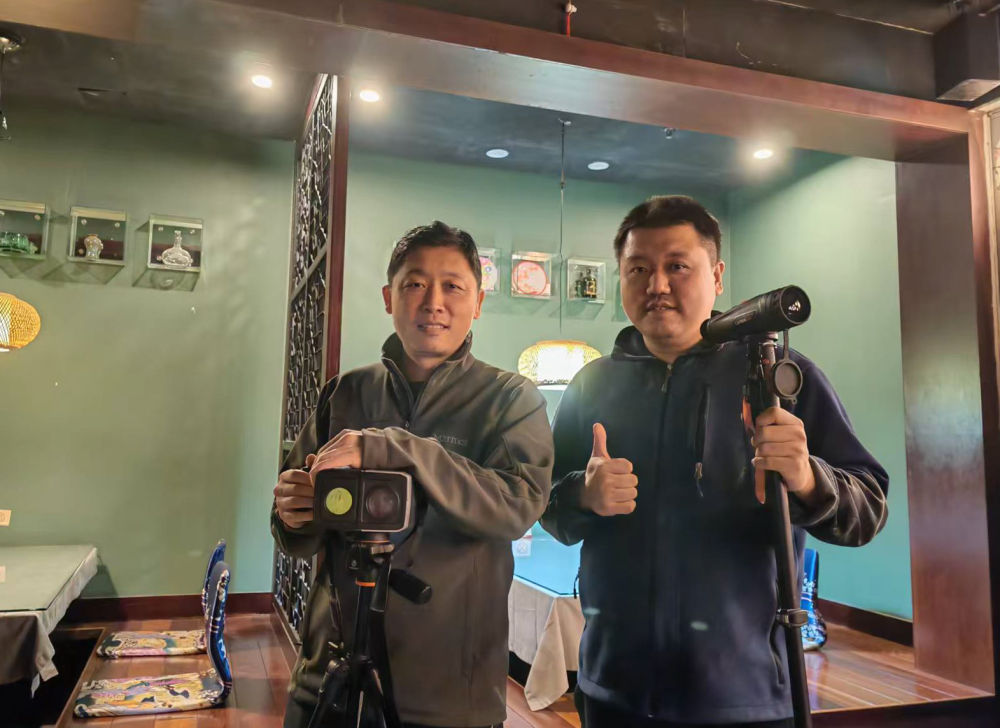 2023年12月24日,新华社记者殷刚(左)和才扬在木马童话黑暗餐厅完成拍摄后合影留念。