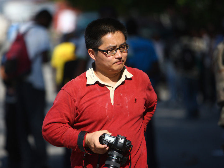 新华社记者邢广利在海地首都太子港地震现场采访。新华社记者 袁满 摄