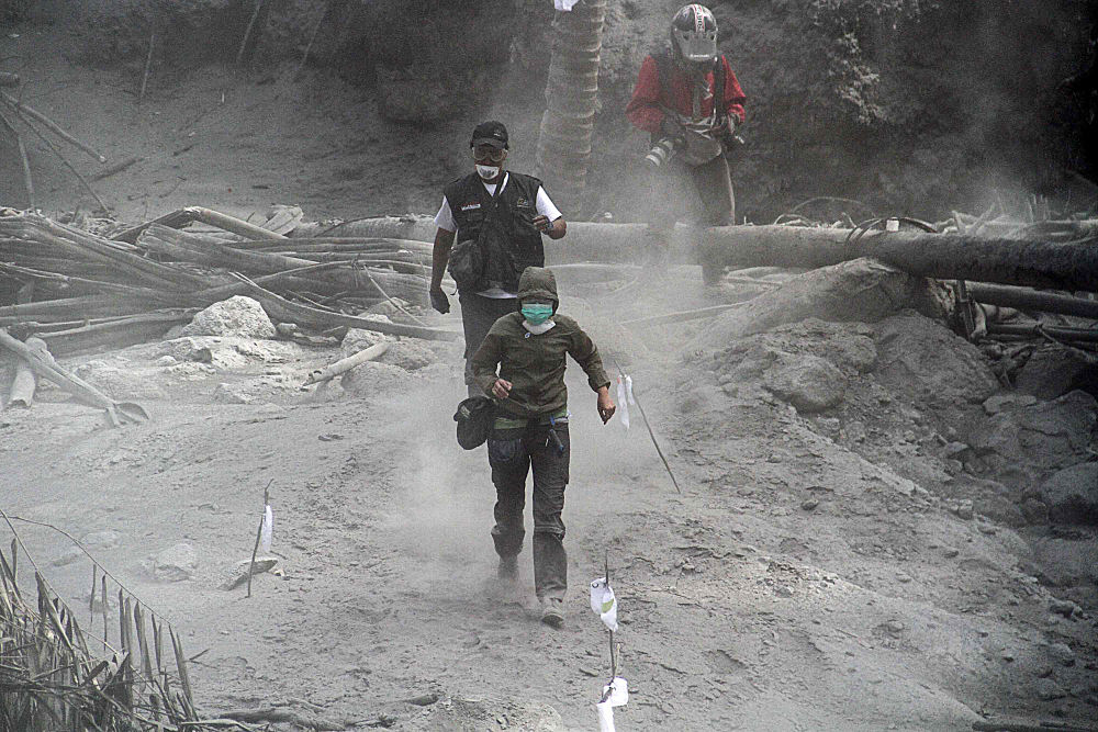 2010年11月7日,新华社记者张玉薇(前)在距印尼默拉皮火山7公里的内铺瑞南村拍摄时,在火山喷发警报突然响起后火速撤离。