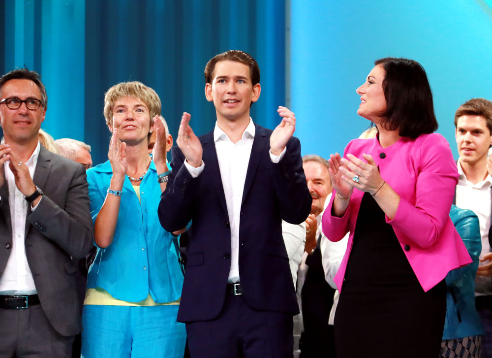 2017年9月23日,在奥地利首都维也纳,奥地利人民党主席、总理候选人库尔茨(中)出席竞选集会。新华社记者 潘旭 摄