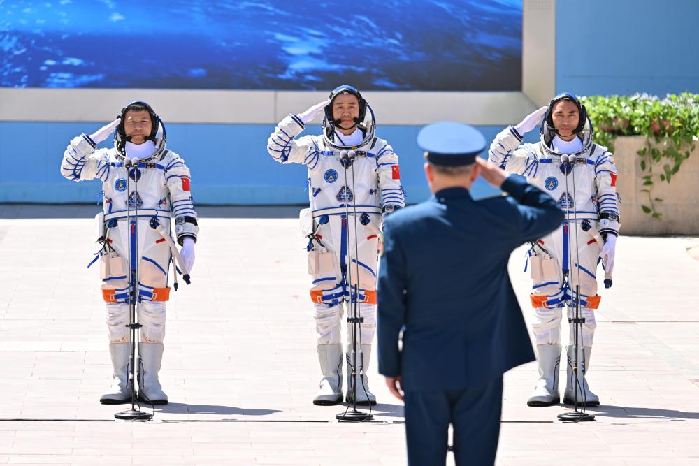 2025年4月24日,神舟二十号载人飞行任务航天员乘组出征仪式在酒泉卫星发射中心问天阁圆梦园广场举行。这是航天员陈冬(中)、陈中瑞(右)、王杰在出征仪式上。新华社记者 李鑫 摄