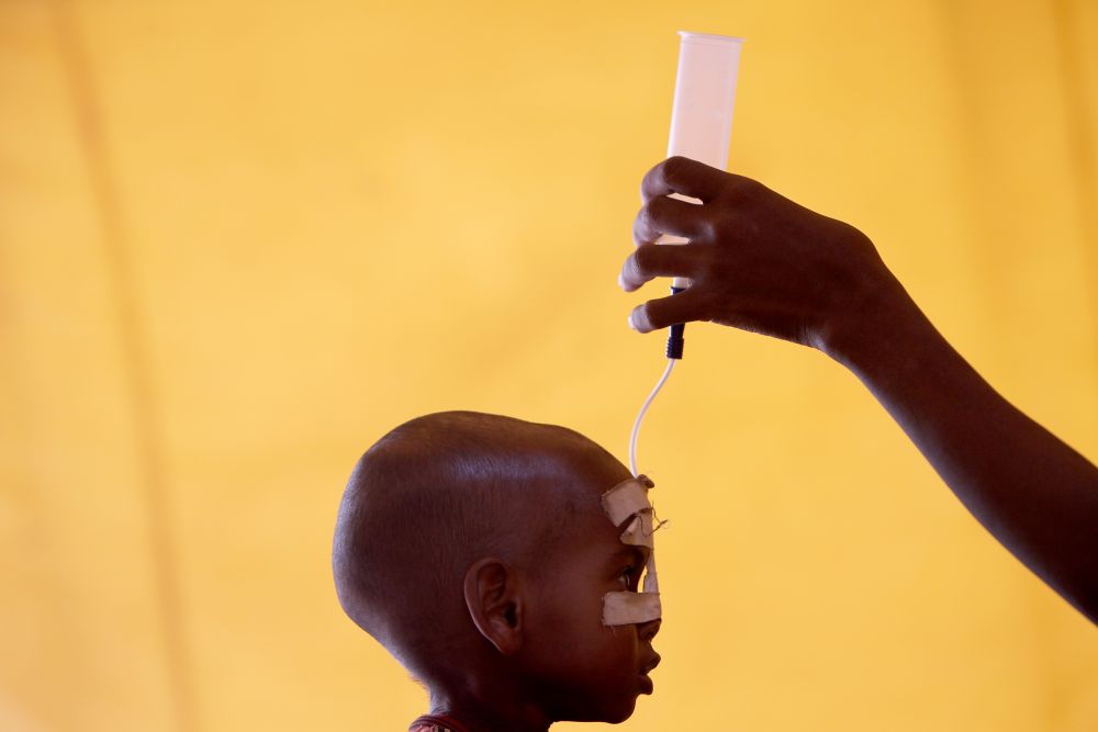 2011年8月20日,在位于埃塞俄比亚边境小镇多洛阿多的科贝难民营的无国界医生组织(MSF)医疗站,一名孩子因营养不良而无法进食,他的母亲用导管给他喂食。新华社记者 金立旺 摄