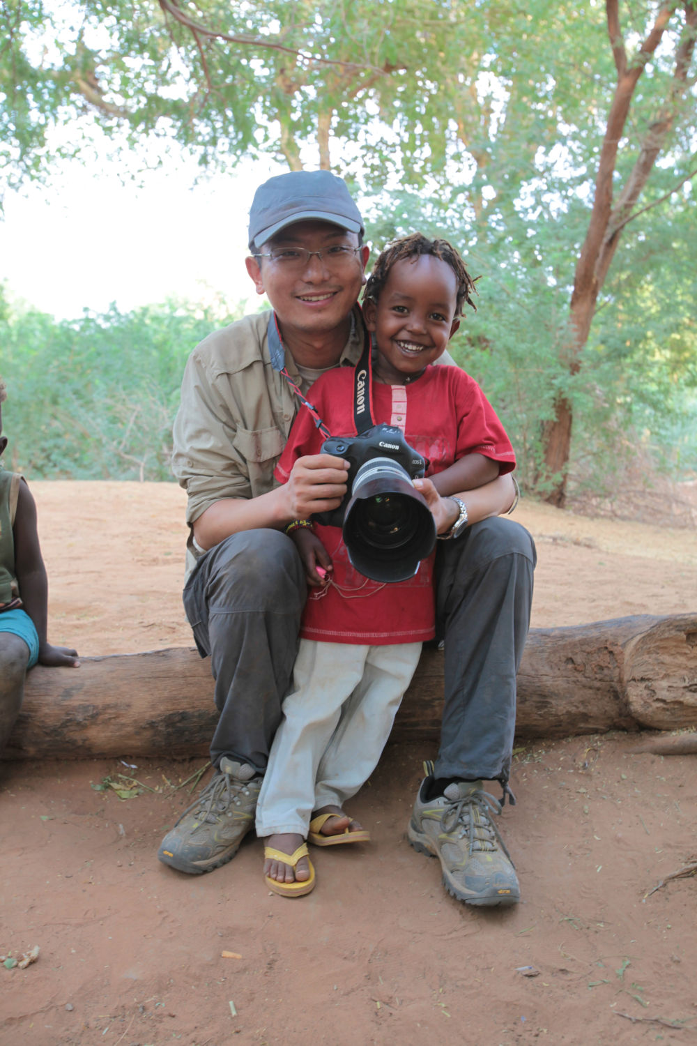 2011年8月22日,新华社记者金立旺在埃塞俄比亚和索马里边境采访难民时和一名当地小孩互动。