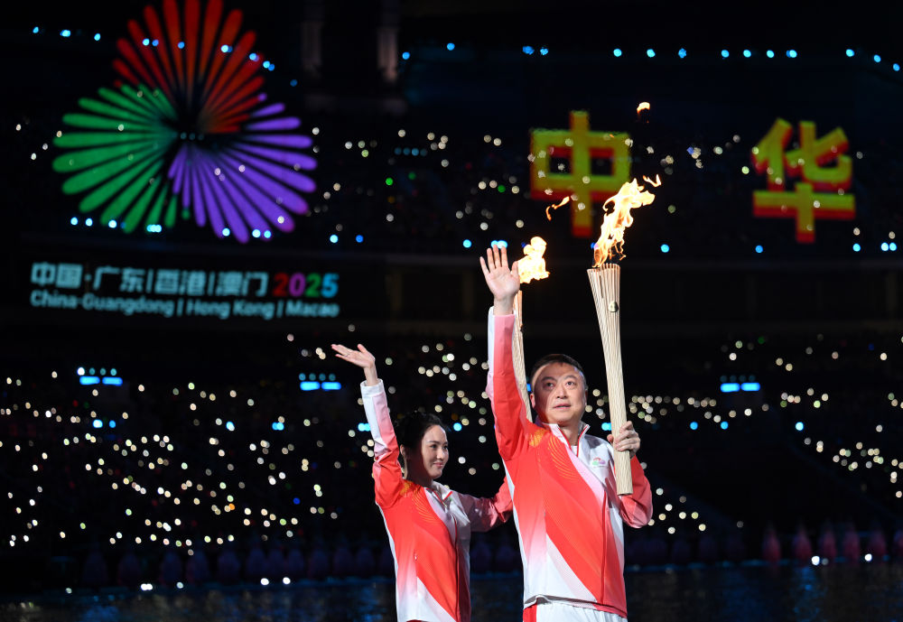 旗手护送中华人民共和国运动会会旗和第十五届全国运动会会旗入场。新华社记者卢汉欣摄
