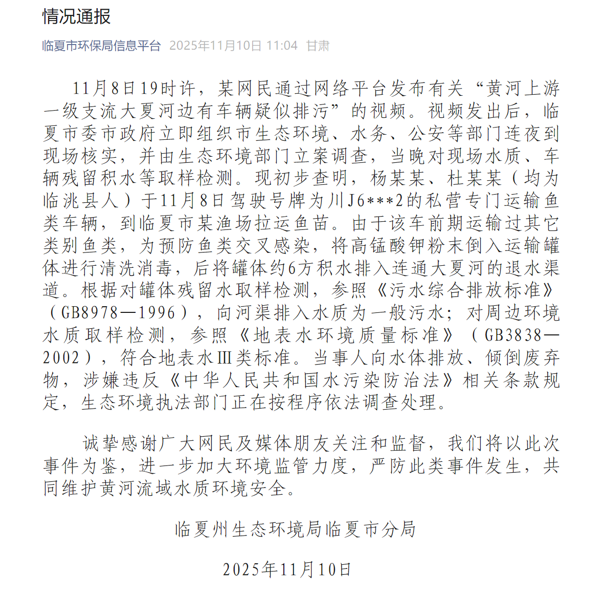 ·甘肃临夏官方通报“罐车在大夏河排放不明液体”:水质为一般污水,当事人被调查。