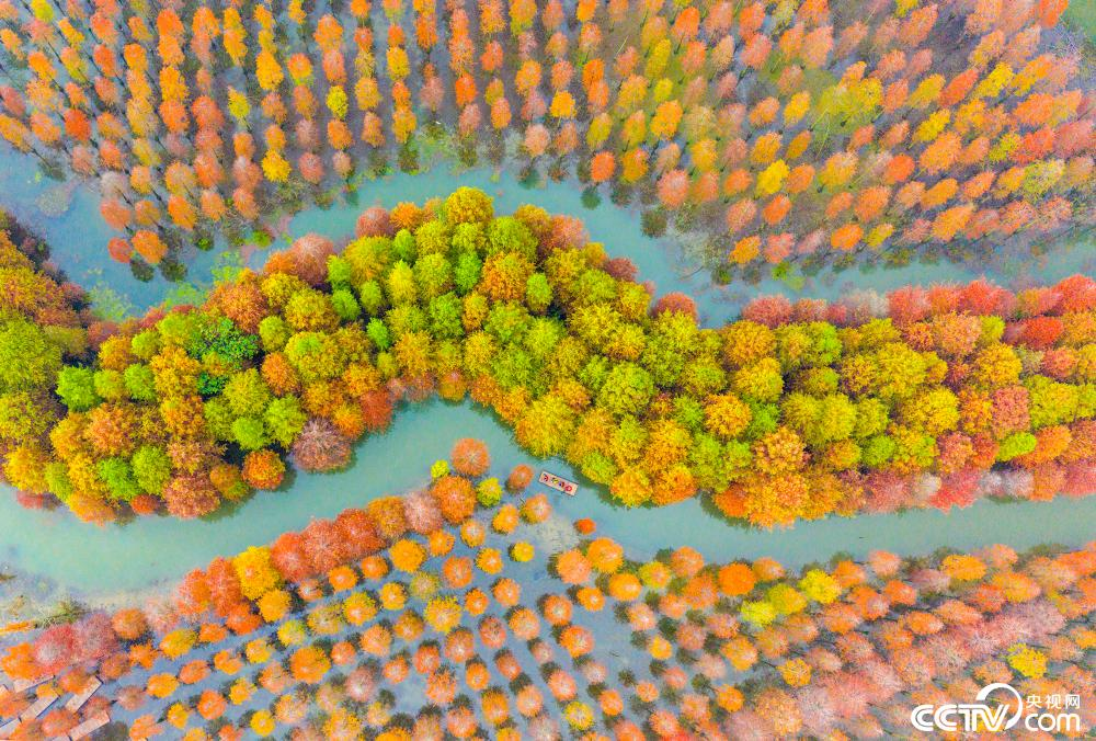 11月9日,江苏泗洪洪泽湖湿地景区临淮段水杉林迎来最佳观赏期,层林尽染、色彩斑斓的红装景致吸引众多游客。