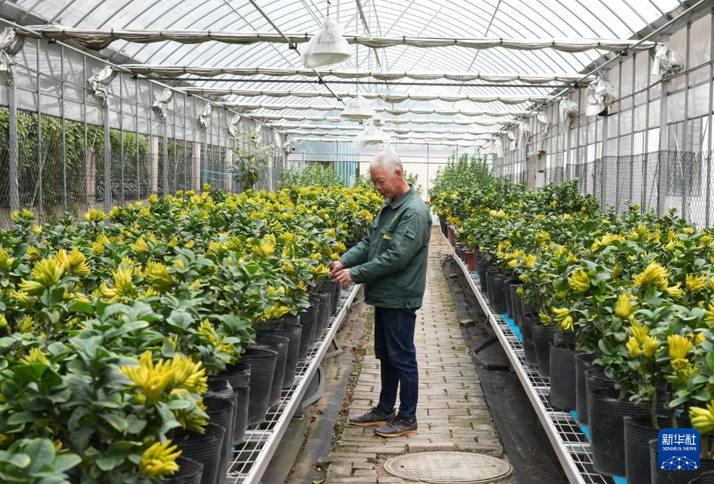 11月11日,在位于婺城区白龙桥镇的一家佛手种植企业,工作人员在整理佛手盆栽。