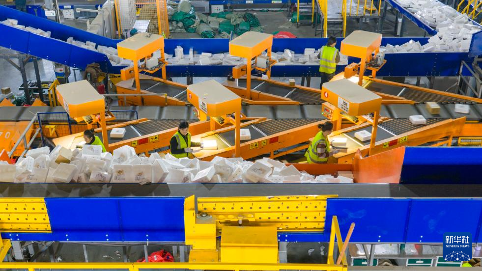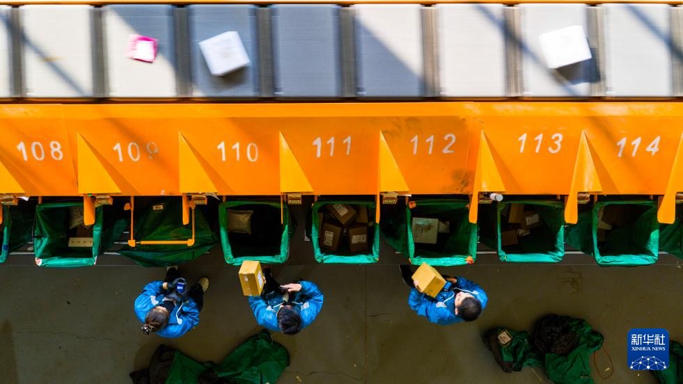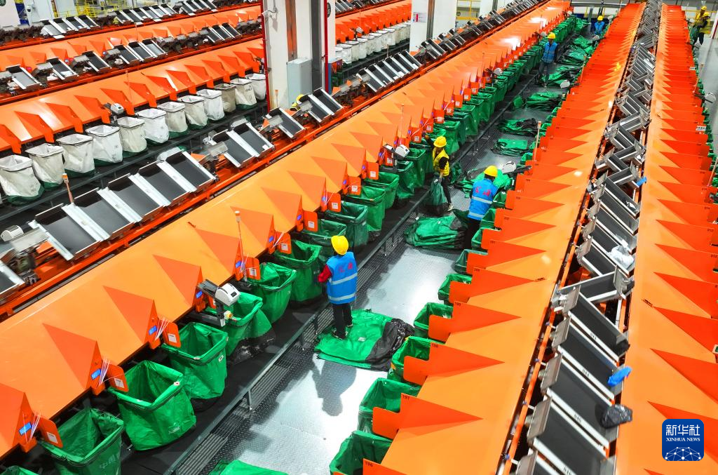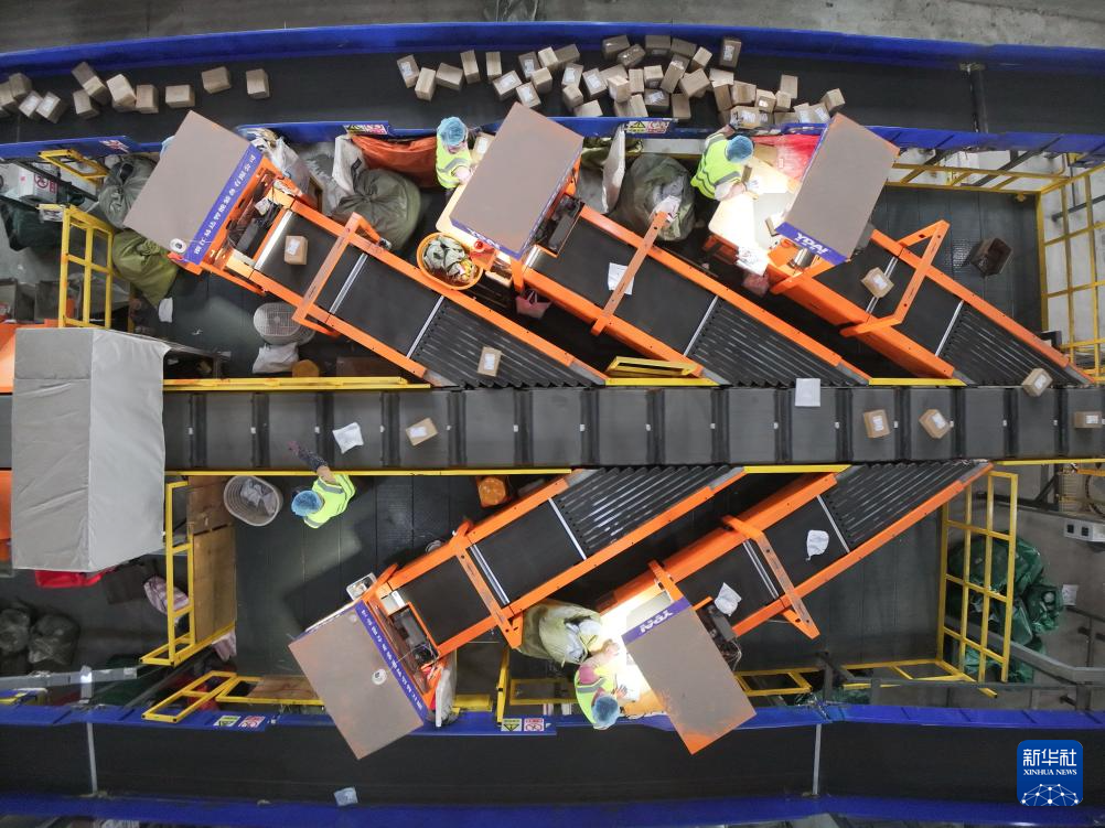11月10日,在中国邮政集团有限公司江苏扬州邮件处理中心,工作人员在分拣快递包裹(无人机照片)。