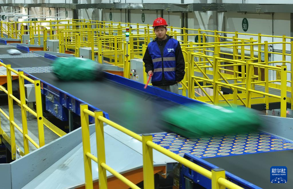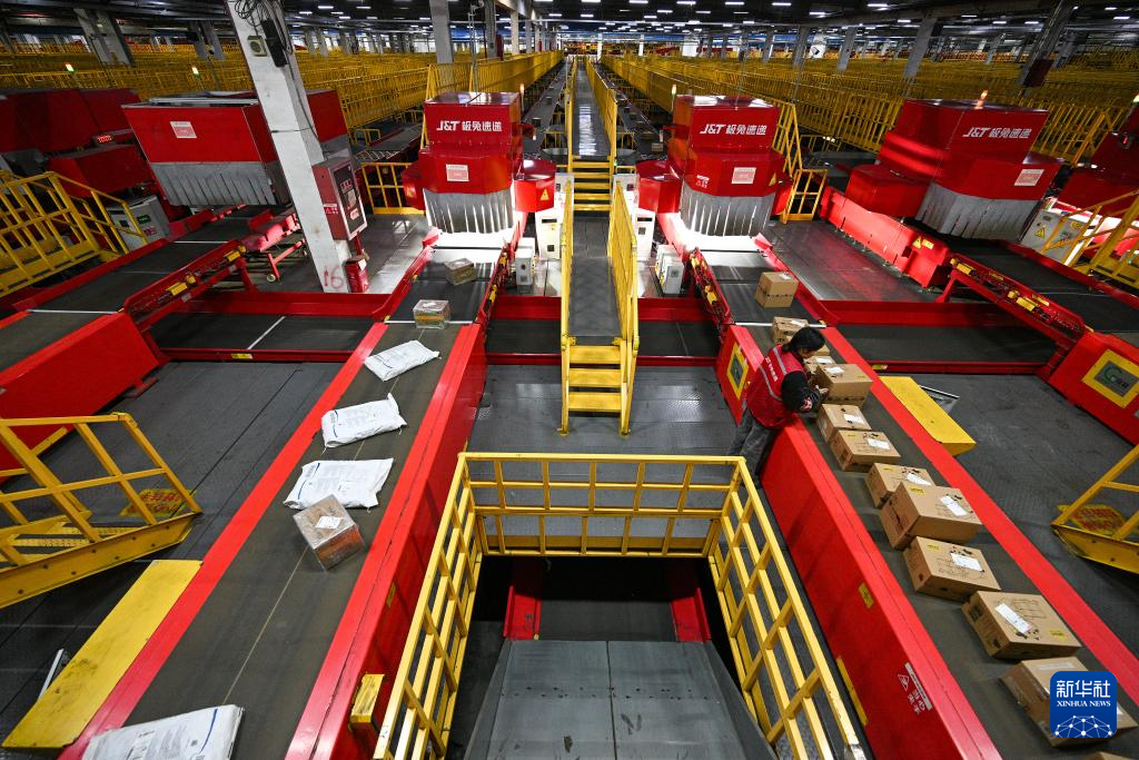 11月11日,工作人员在位于南京市江宁区的极兔速递转运中心的智能分拣线上分拣快递包裹。