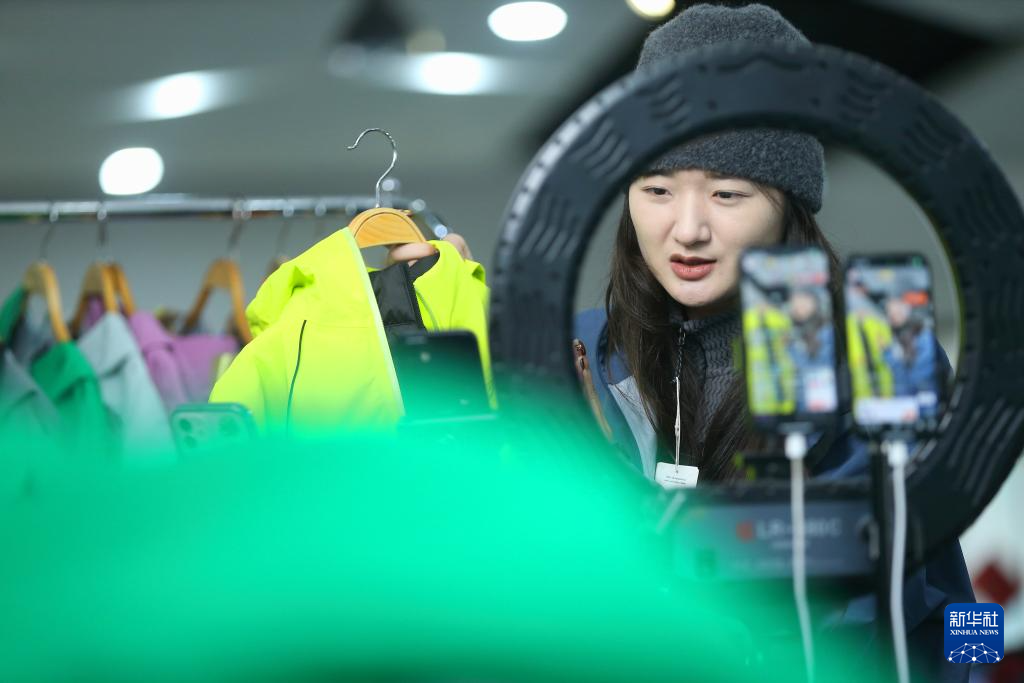 11月11日,在山东省青岛市即墨区即发集团,一名网络主播在直播销售服装产品。