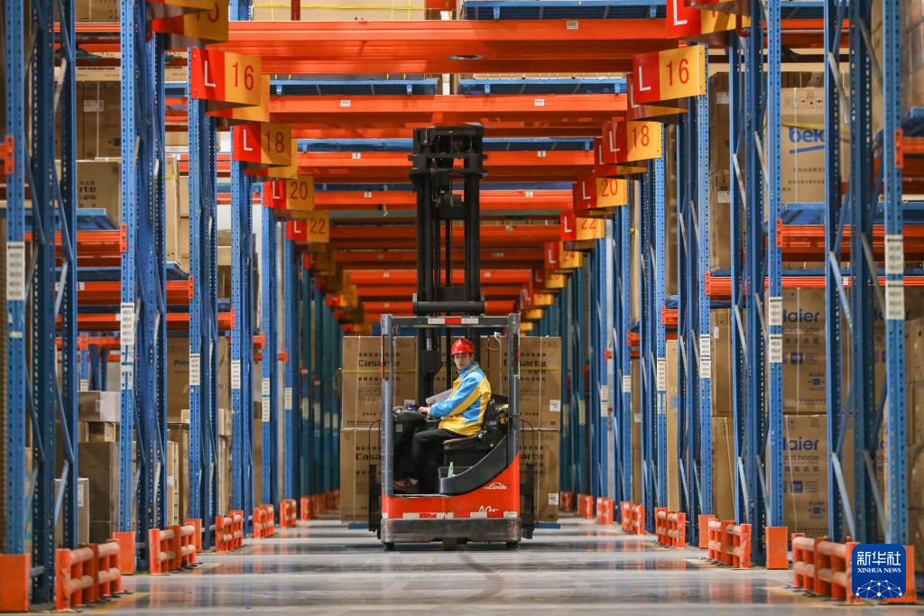 11月11日,在河南省南阳市万德隆大型综合产业园物流配送中心,工人在仓库运送商品。