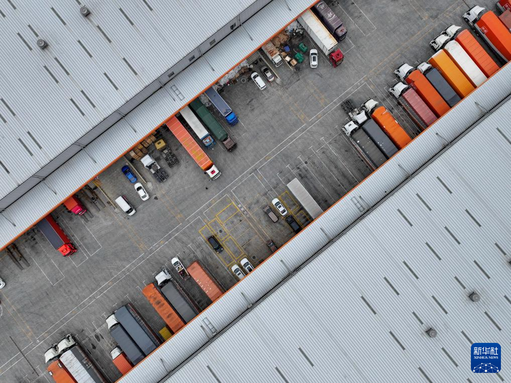 11月11日,快递运送货车停靠在位于贵州省龙里县的贵州快递物流园内装卸货(无人机照片)。