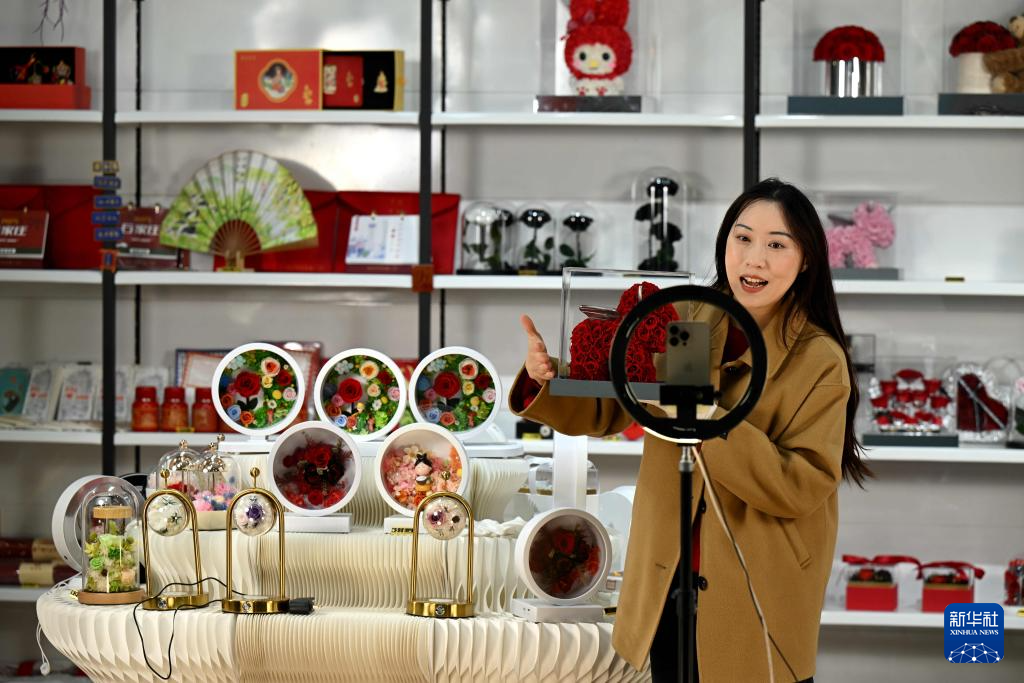 11月11日,在河北省石家庄市那些花儿文化旅游产业示范基地,工作人员在直播带货。