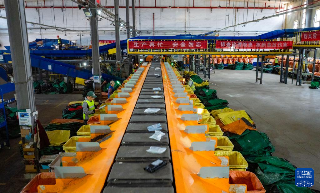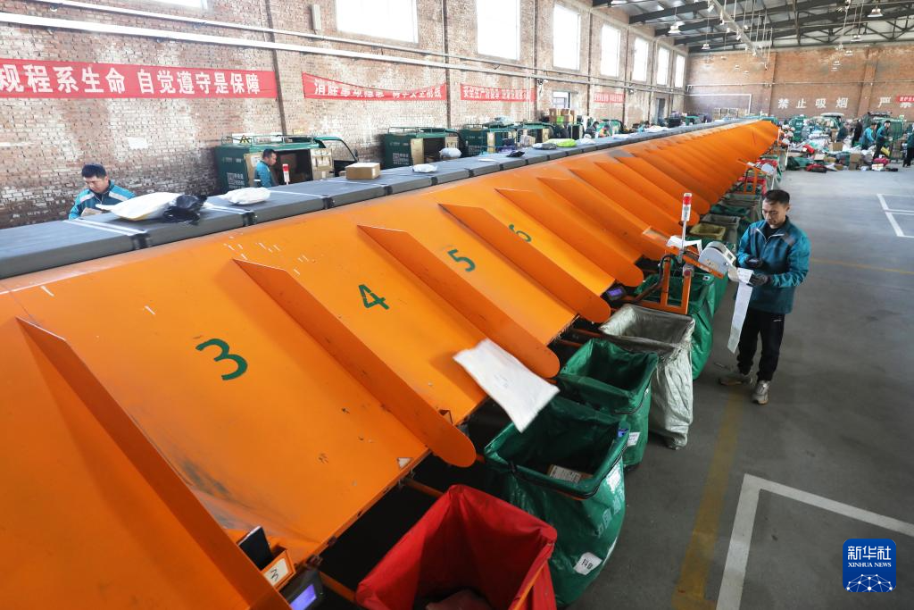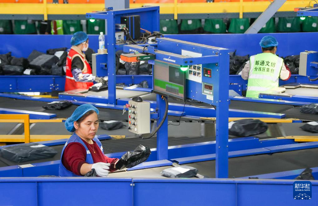 11月11日,在中国邮政集团有限公司河北省唐山市丰润区分公司邮件处理中心,工作人员在分拣车间忙碌。