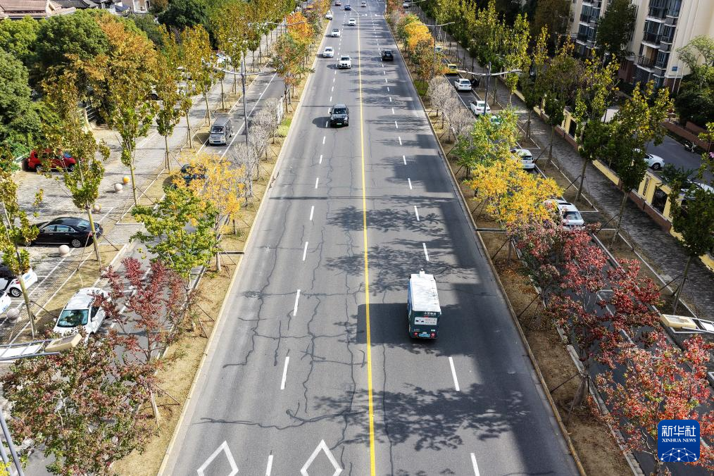 11月11日,无人驾驶快递车在江苏省扬州市街头运送快递包裹(无人机照片)。