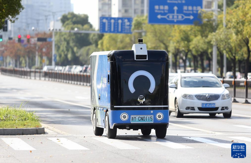 11月11日,无人驾驶快递车在江苏省扬州市街头运送快递包裹。