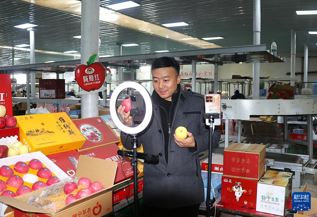 11月11日,在甘肃省平凉市静宁县工业园区的一家苹果企业,网络主播在推介静宁苹果。