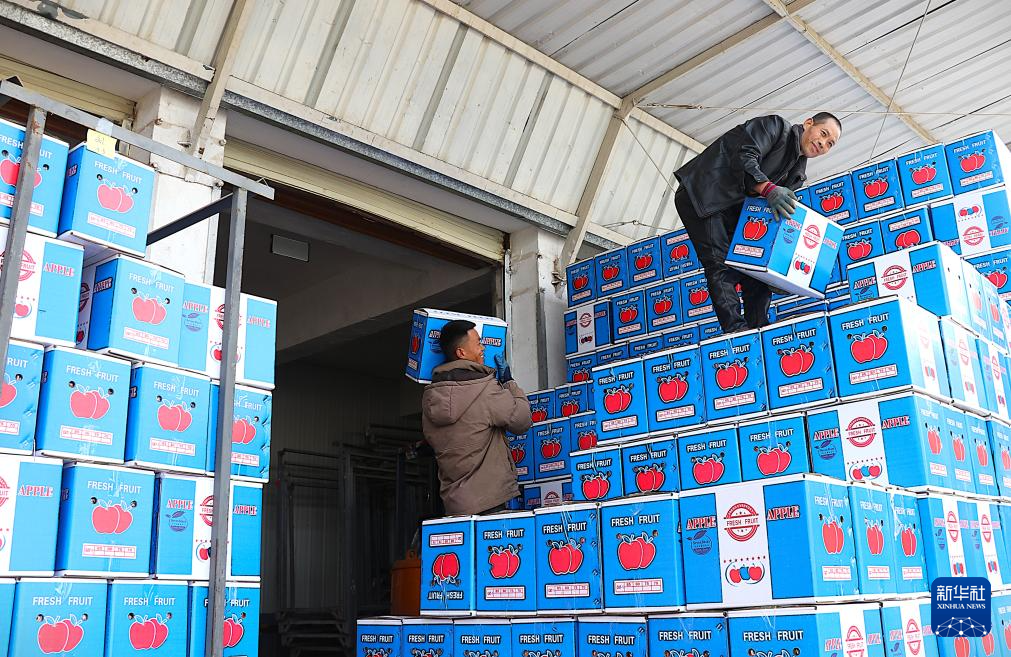 11月11日,在甘肃省平凉市静宁县工业园区的一家苹果企业,工人将包装好的苹果装车准备销售。