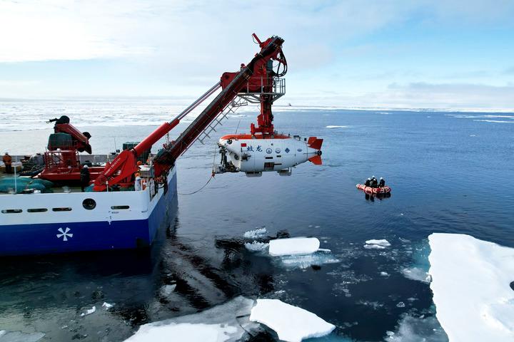 2025年8月11日,“蛟龙”号在北极冰区准备下潜。海冰加速融化,北冰洋的生态系统正经历重组